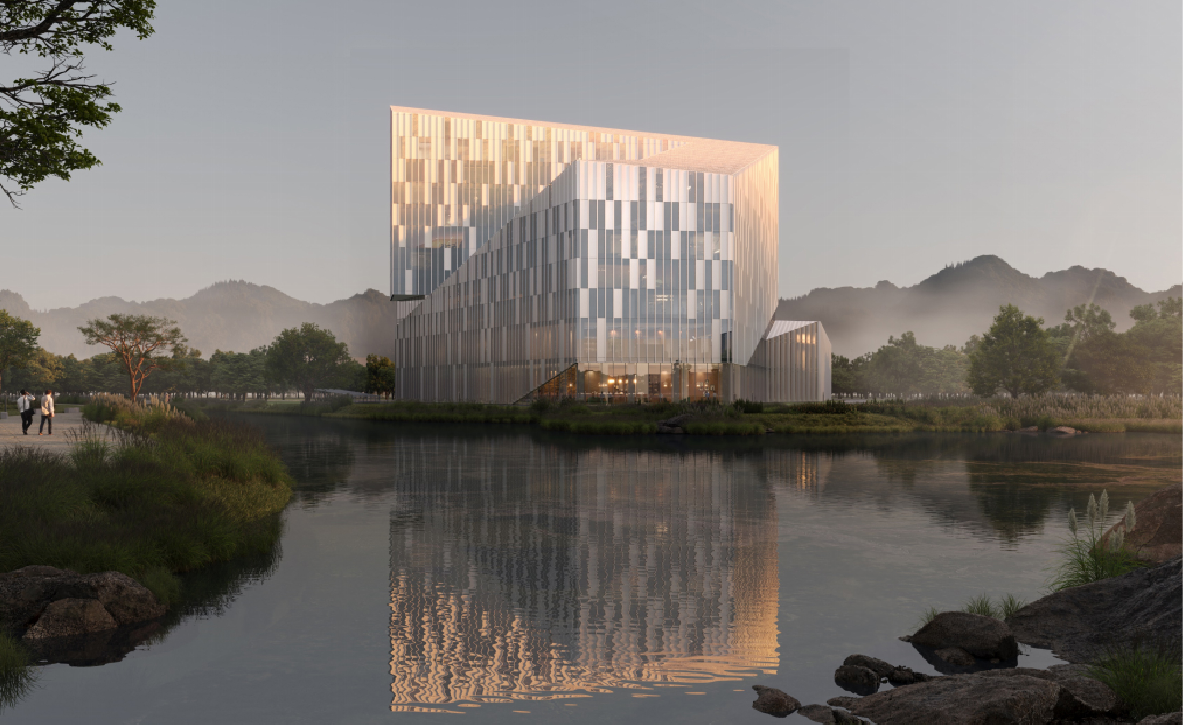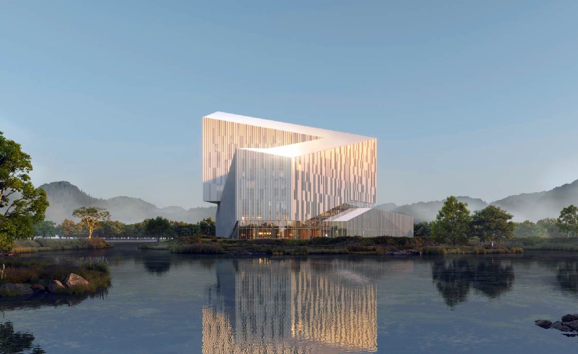 建筑外观凝练”日照金山“ 意象,浅金色参数化格栅与玻璃幕墙互为呼应,光影流转间复刻川西瑰丽地貌。更以”北聚南透“破局,将会议区高效北向衔接交通,客房与休闲区沿湖岸错动排布,让建筑成为一座嵌入山水的 “可栖居观景台”,以设计语言完美诠释天人合一的东方哲思。
